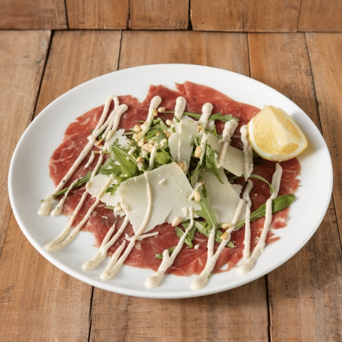 Mozzarella, tomatensaus, gerookte zalmsnippers en rucola